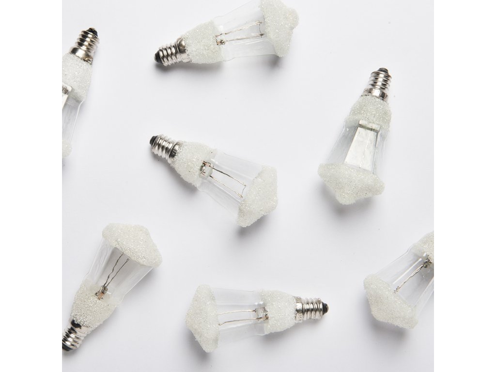 Traditional handmade glass bulb. Package contains 36 bulbs with clear bulb and white balotine. Smaller quantities of bulbs can be purchased in box of 3.