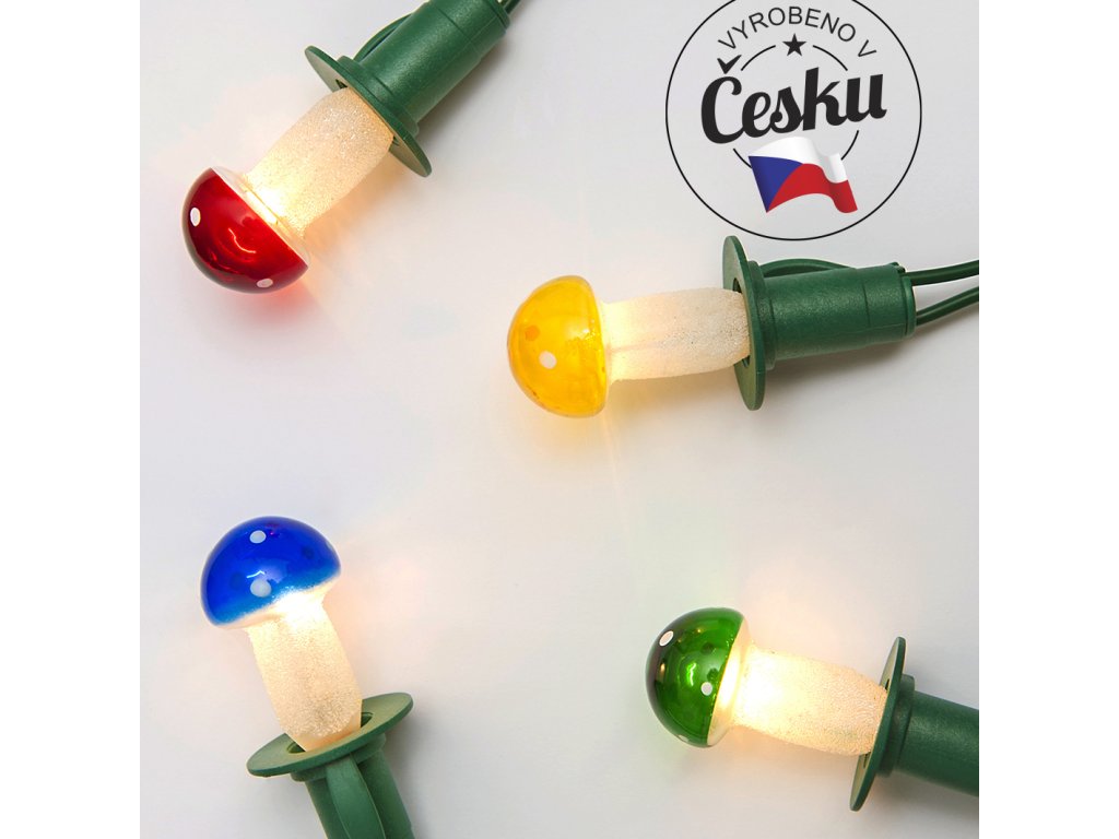 Tradiční osvětlovací souprava se skleněnými žárovkami tvaru MOCHOMŮRKA. Česká ruční výroba, navazujicí na výrobu vánočních souprav Heliand od roku 1946 v Piešťanech. Určena do střední velikosti stromků. Uchycení na větvičky pérkem.