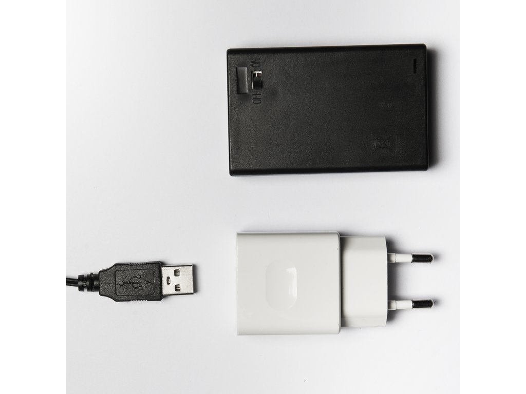 Napájení 3-mi kusy AA 1,5V tužkových baterií nebo USB nabíječkou s příkonem minimálně 1W. USB nabíječka není součástí balení, prakticky každá domácnost ji dnes vlastní někdy i více kusů.